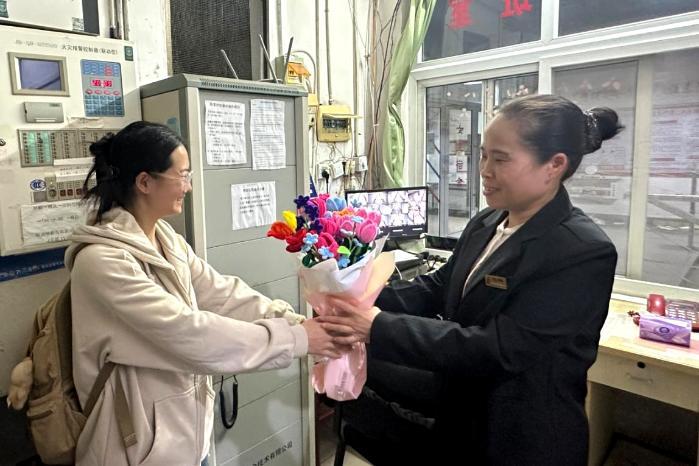 在学生社区这个融学习、生活、交往于一体的空间里,同学们自发地将所有亲手制作的手工花送给宿管阿姨。“阿姨,您辛苦了!”这一举动,超越了单纯的手工制作,是一场深刻的感恩教育实践。