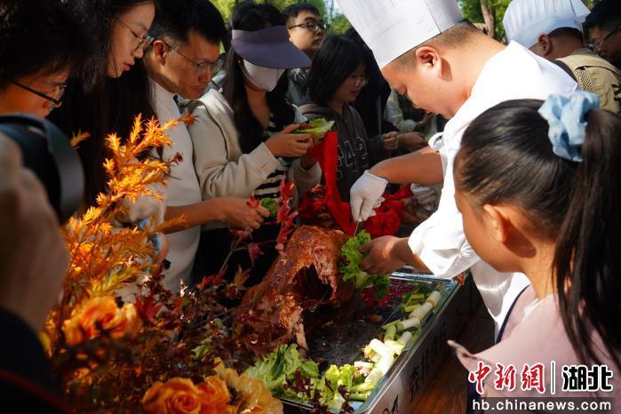 当天,森林烤场人头攒动。上午10点18分,威风凛凛的舞狮表演热闹开场,两只色彩斑斓的狮子眨眼、摆头,随着锣鼓节奏跳跃翻腾,引得观众阵阵喝彩。在场嘉宾为东湖森林烤场正式开业进行剪彩。“五、四、三、二、一,开窑!”随着烧烤师傅一声吆喝,金灿灿、香喷喷的烤全羊出窑,在场嘉宾进行烤全羊首切,标志着东湖森林烤场正式开业迎客。