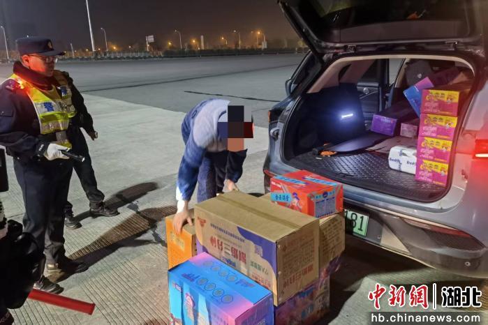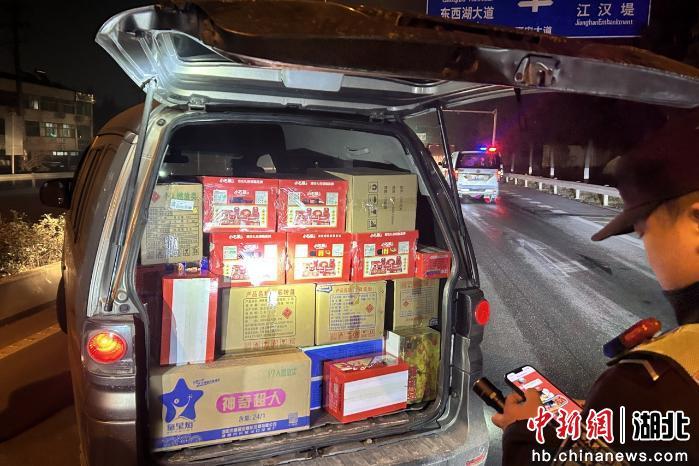 12月6日凌晨1时许,一辆SUV新能源车在洪山区分局张家湾检查站的卡点被拦下。民警观察到前排一男一女面色紧张,当打开其后备厢,竟发现里面藏有42箱未拆封的烟花爆竹。