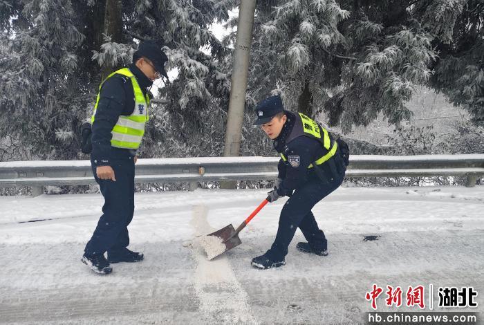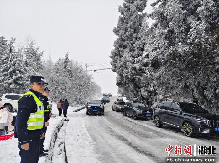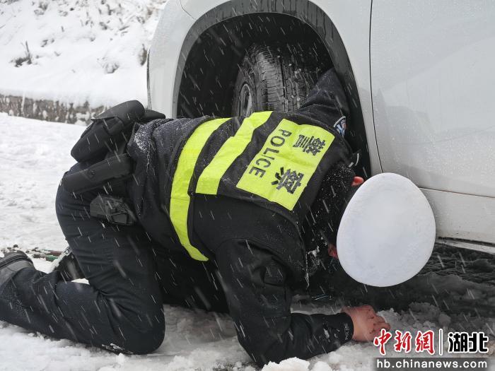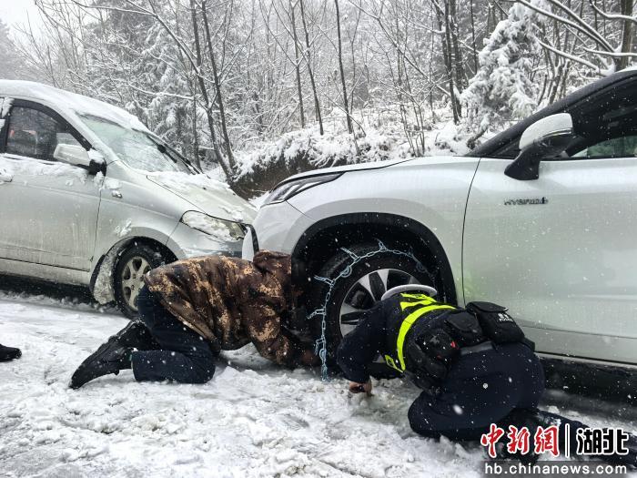 中新网湖北新闻1月3日电 (李剑飞)2026年1月1日,元旦佳节清晨,平均海拔1600米的恩施市板桥镇大山顶村气温低至零下,鹅毛大雪仍在持续。板桥派出所副所长张金星和同事牟卫明冒着刺骨寒风,在恩川线路段为过往驾驶员安装防滑链、叮嘱安全事项,口中呼出的白气在低温中瞬间凝结。这是暴雪突袭后,他们坚守岗位的第二天。