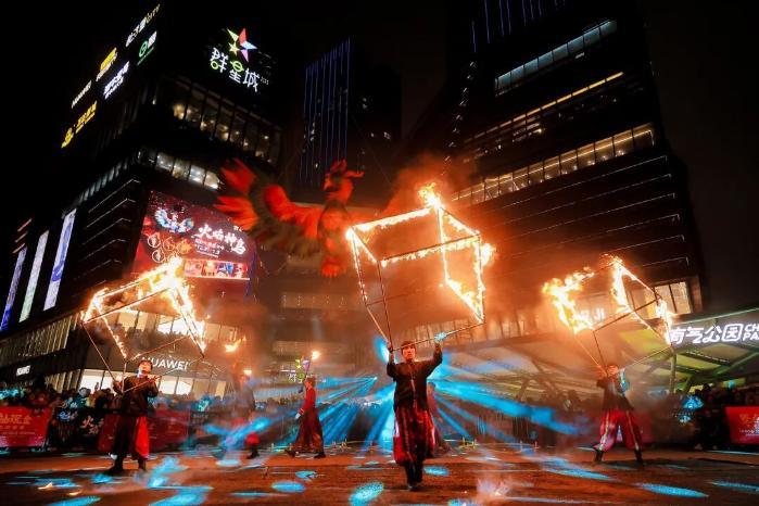 群星城上演火焰神鸟奇幻火舞嘉年华,全国首创7米巨型火舞飞凤震撼上演,点燃璀璨夜空。