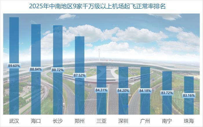 中新网湖北新闻1月10日电(谢萧南 操冲)2025年,武汉天河机场起飞正常率(即不晚于“航班计划出港时间+地面标准滑行时间”前起飞算正常)全年平均值达到89.60%,排名中南地区9家千万级以上机场第一名、全国40家千万级以上机场第九名。