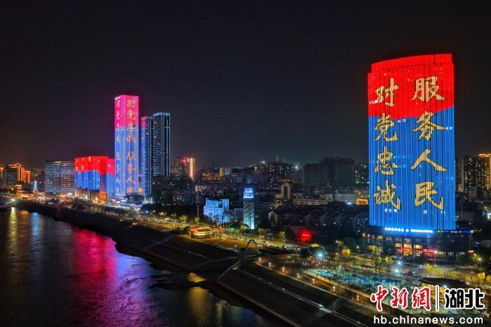 1月10日晚,宜昌沿江楼宇点亮“警察节”主题灯光秀,致敬人民警察。