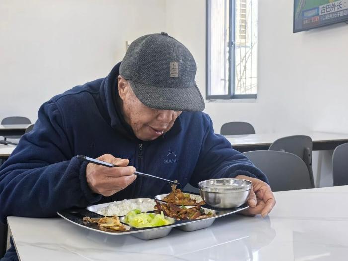 刚打完饭的喻天俊老人赞不绝口