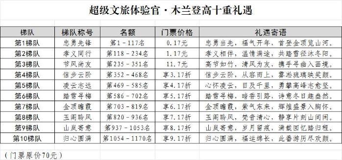“超级文旅日,惠游木兰山”门票秒杀福利即刻上线,1170张木兰山特价门票现开启秒杀,特价票0.17元起,覆盖10个福利梯度,每档限量117张。游客先扫码加入专属活动群,并参加报名接龙(备注手机号后5位),根据群接龙报名序号享受对应阶梯秒杀价。1月17日,报名游客至木兰山风景区胜景广场“超级文旅日咨询点”,凭接龙序号和手机号,按对应阶梯秒杀价兑换购票入园(每个手机号限购2张)。兑票时间为9:00--15:00,凭购票二维码至景区入口核销进园。景区开放时间为9:00--17:00。本次特价票有效期仅限1月17日活动当天有效。