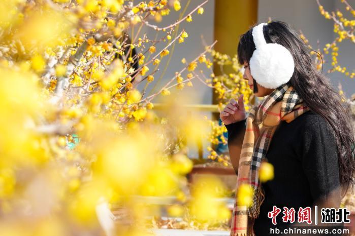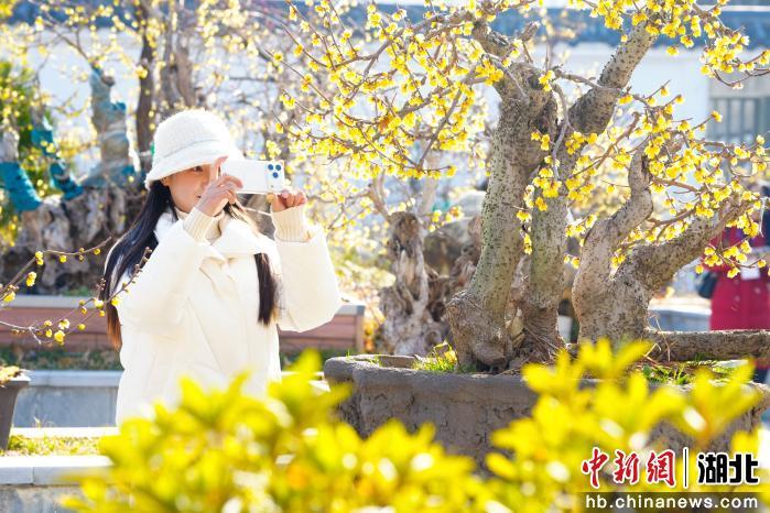 1月16日,在湖北省保康县蜡梅公园,寒枝缀金,蜡梅花开。不少游客慕名而来赏花打卡,用镜头定格冬日的“金色浪漫”。(张玮)