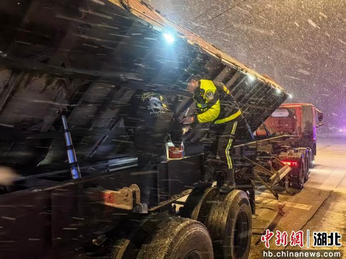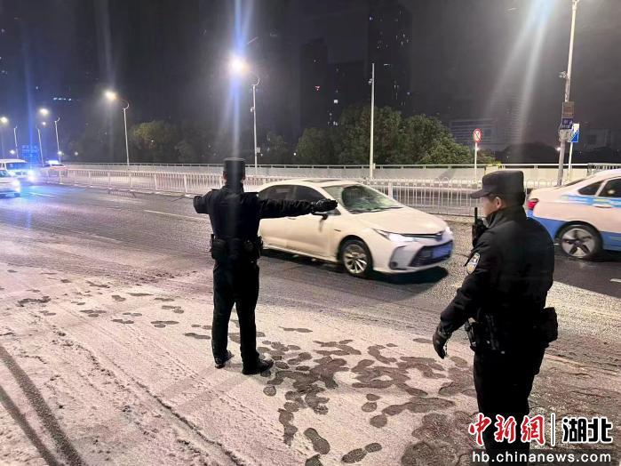 在月湖桥相连的高架路段,硚口区分局交通管理大队二中队中队长唐加印与同事们彻夜巡逻,警灯照亮飘雪的夜空。他们配合城管部门融冰除雪,引导车辆有序缓行。遇到因路况不熟误上高架的大货车,唐加印耐心指引,帮助司机安全驶离。