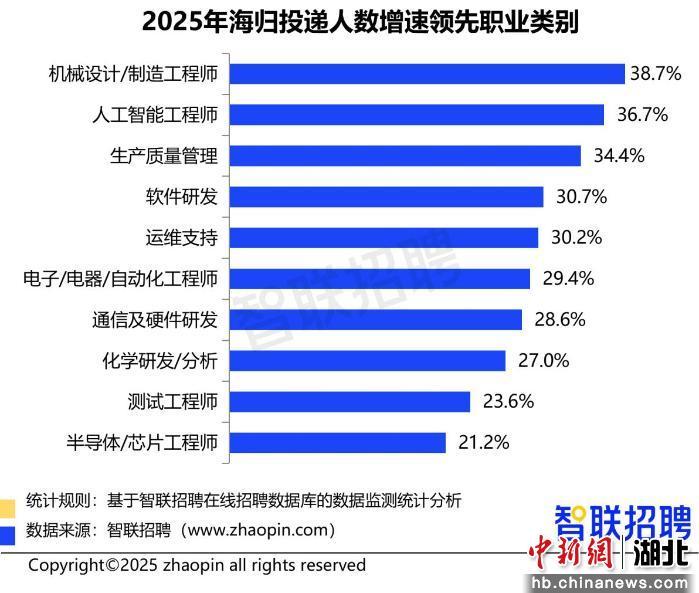 中新网湖北新闻1月28日电 (白雪)智联招聘近日发布的《2025中国海归就业调查报告》显示,2025年应届留学生回国求职规模同比增长12%,创8年来新高,超八成留学生拥有硕士学位,专业分布与新质生产力发展需求高度契合,海归人才正加速向中国新质生产力核心领域集聚。