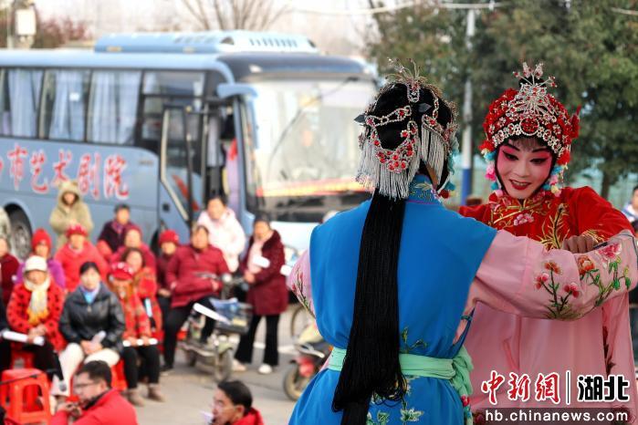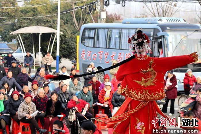 中新网湖北新闻1月29日电 (徐文博 李靖宇 张子纬)湖北省老河口市“戏曲进乡村”专场演出27日走进王府洲晨光村。青年演员们以戏传情、以艺通心,用精湛的表演为群众送上了一道精彩纷呈的传统文化大餐,让醇厚乡音萦绕村头,使传统艺术扎根基层。