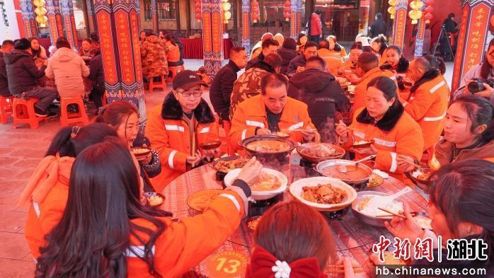 中新网湖北新闻1月30日电 (申玉洁 梅燕)近日,一场由湖北鹤峰县新的社会阶层人士联谊会发起、社会各界爱心人士“众筹”的“暖心刨汤宴”在中营镇大路坪温情开席。百余名环卫工人分批次受邀赴宴,在热腾腾的饭菜与欢声笑语中,感受到了来自社会各界最真挚的敬意与关怀。