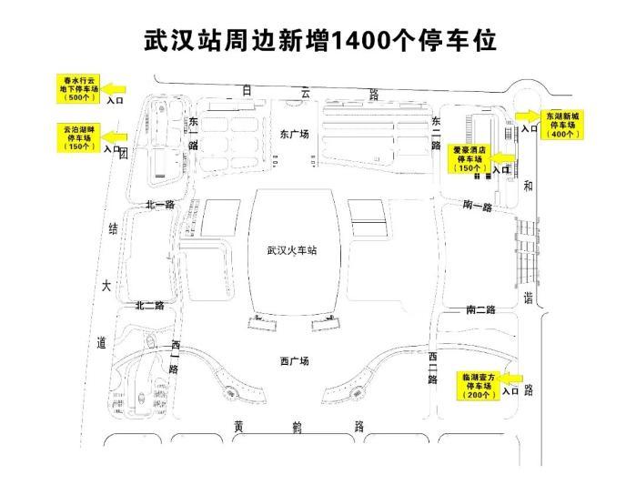 2.武汉站除了原有的3个社会停车场(P1、P2和P3共2464个车位)外,还协调新增了5个社会停车场,共1400个停车位:春水行云地下停车场500个车位,云泊湖畔地上停车场150个车位,位于武汉站团结大道与白云路交会处;东湖新城停车场400个车位,位于白云路与和谐路交会处;爱豪酒店停车场150个车位,位于P3停车场旁长途客运站;临湖壹方停车场200个车位,位于和谐路与黄鹤路交会处,请旅客根据需求自行选择。(完)