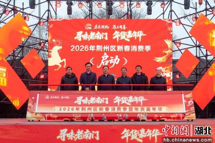中新网湖北新闻2月5日电(王杰)2月4日上午,荆州市荆州区老南门广场人声鼎沸、锣鼓喧天。由荆州市商务局、荆州区人民政府联合主办的“乐在湖北‘马’上有喜”2026荆州区新春消费季暨年货嘉年华,在热烈欢腾的氛围中正式拉开帷幕。活动现场文艺演出精彩纷呈,年货摊位琳琅满目,市民采购热情高涨,洋溢着一片喜庆祥和的新春气氛。