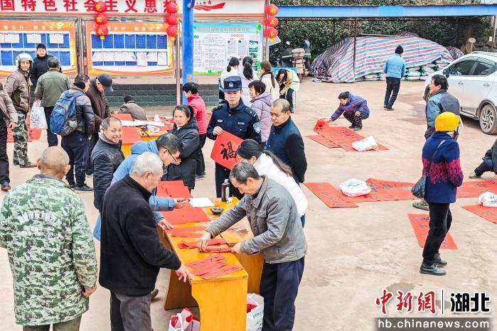 中新网湖北新闻2月5日电(刘艳 望娟娟)远安县茅坪场镇福河村村委会院子里4日春意融融。一幅幅大红的春联一字排开,空气中弥漫着淡淡的墨香与欢快的谈笑声。这里正在举行的“迎春送福”活动,让小山村提前有了春节的喜庆。