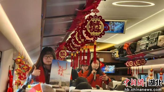 列车平稳行驶后,温馨活动正式拉开帷幕。联通公司李兰月的一曲《常回家看看》开场,熟悉的旋律勾起了众人的思乡之情,不少人跟着轻轻哼唱;互动小游戏“年味接龙”环节中,全员参与,轻松又解压;小朋友演唱的《新年好》和老乡曹昌云表演的歌曲《暖暖》,现场掌声不断,车厢内气氛热烈又欢乐。