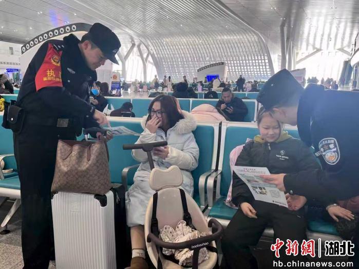 中新网湖北新闻2月11日电 (李玉冰)2月10日的襄阳东站候车大厅宽敞明亮,火红的灯笼、喜庆的装扮将节日氛围感拉满,一场别开生面的“小年安全大讲堂”在这里热闹开讲。为了让返乡旅客带上“安全”行囊,襄阳铁路公安处襄阳东站派出所民警们将法制安全宣传台搬到了旅客身边,通过面对面讲解、互动式问答,为南来北往的旅客送上了一份特别的“平安年礼”。