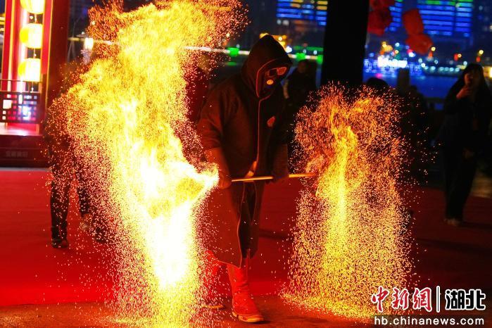 当晚还进行了系列民俗表演。舞狮表演、火壶表演惊艳亮相,传递“火除邪祟,万家安宁”的美好寓意;“郭靖黄蓉”经典形象重现古城,还原经典场景,让市民游客感受古城的侠义情怀;新年歌曲千人大合唱、空中飞马星驰表演轮番上演,歌声嘹亮,舞姿灵动,将新春的喜悦传递到现场每一个角落。