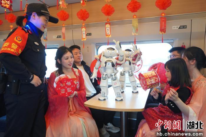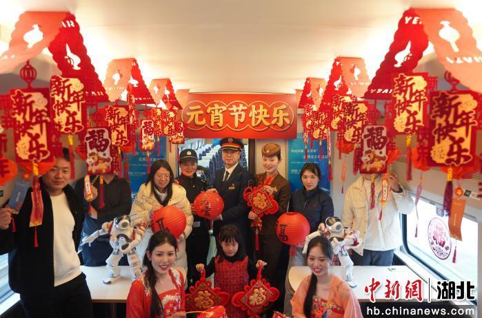 “这花灯设计的真好看,还有反诈灯谜呢。”3月3日农历正月十五元宵节,在汉口开往宜昌东的D5803次列车上,列车乘警、列车员与智能机器人一同和乘车旅客互动联欢,一场别开生面的“移动元宵”主题活动在车厢里正式拉开帷幕。猜灯谜、机器人舞蹈、旅客小朋友朗诵、乘警反诈顺口溜、送汤圆……一个个有趣的活动,让大家在温馨旅途中共度元宵佳节,暖意满满。车厢里的欢声笑语也随着飞驰的列车奔向千家万户。