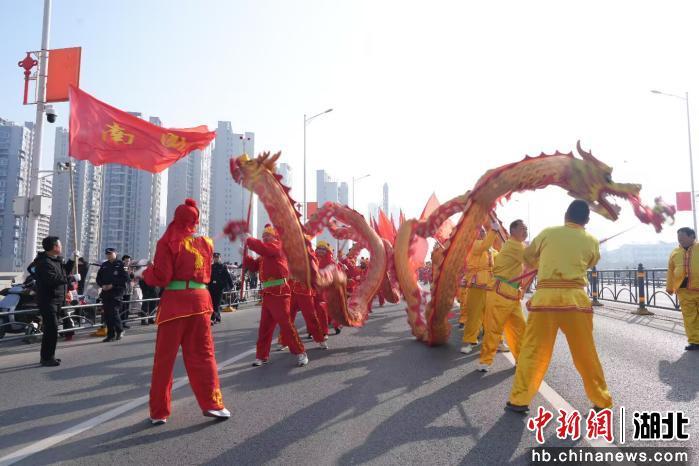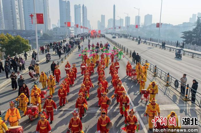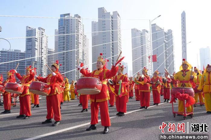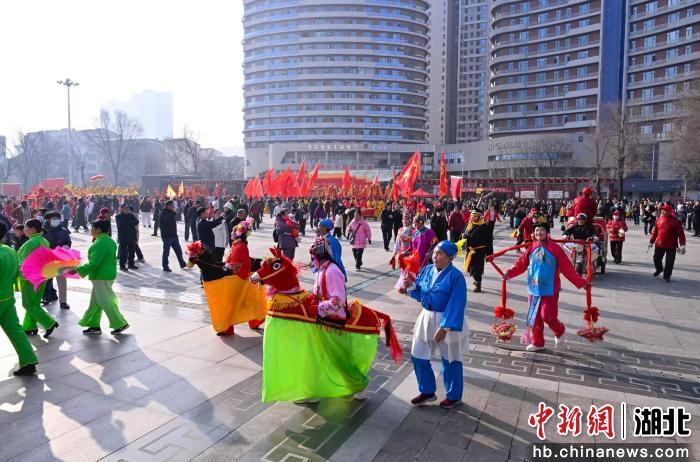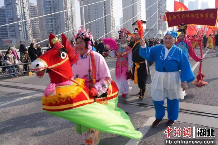 中新网湖北新闻3月3日电 (刘睿喆 聂慧达 钟华)气势恢宏的舞龙舞狮翻腾跳跃,威风锣鼓铿锵有力;传统花轿、喜庆秧歌、腰鼓、扇子舞等节目轮番上演;极具枣阳特色的拉犟驴、老汉背妻、大头娃娃、彩旗方阵等民俗表演原汁原味、妙趣横生,引得群众阵阵喝彩。