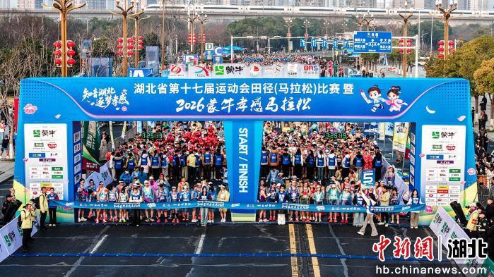 中新网湖北新闻3月8日电(王梦媛 林立)湖北省第十七届运动会田径(马拉松)比赛暨2026蒙牛孝感马拉松8日上午在孝感市文化中心鸣枪起跑。本次大赛汇聚了来自全国各地的16000名选手,也是全国首个以“孝文化”和“甜蜜”为核心主题的马拉松赛事,全面展现“孝爱之城,甜蜜之地”的独特城市气质。