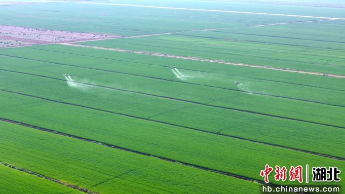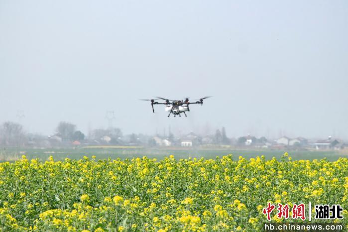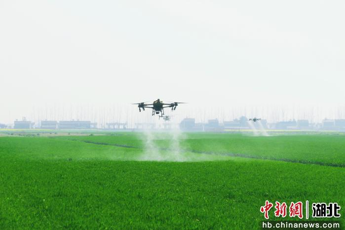 中新网湖北新闻3月13日电 (向冰钰 任宇洁 鲍文喆)春回大地,万物复苏。3月10日,在当阳市草埠湖镇马窑村3000亩小麦和600亩油菜种植田里,8台植保无人机腾空而起,一幅科技春耕的画卷正徐徐展开。