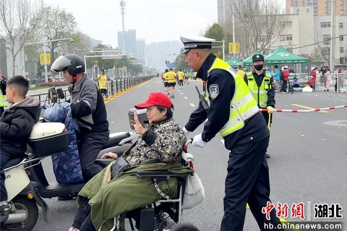 “警官,腿抽筋了,能不能帮忙摁一下。”10时许,洪山区分局民警黄武略正在仁和路赛段靠近终点方向执勤。突然,一名身着深色运动服的选手踉跄着从赛道内侧跑出,单手扶住隔离水马,表情痛苦地蹲下身来。黄武略快步上前蹲下,一边轻声安抚,一边稳稳按压。不一会儿,选手紧皱的眉头渐渐舒展开来。“好多了,谢谢警官!”他试着站起身,活动了两下腿脚,脸上露出如释重负的笑容。