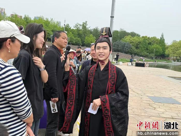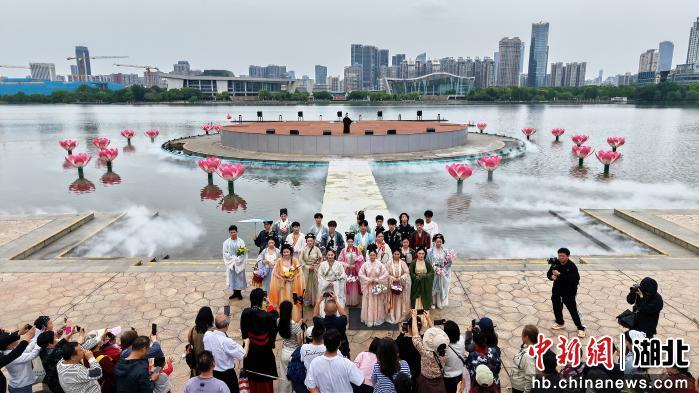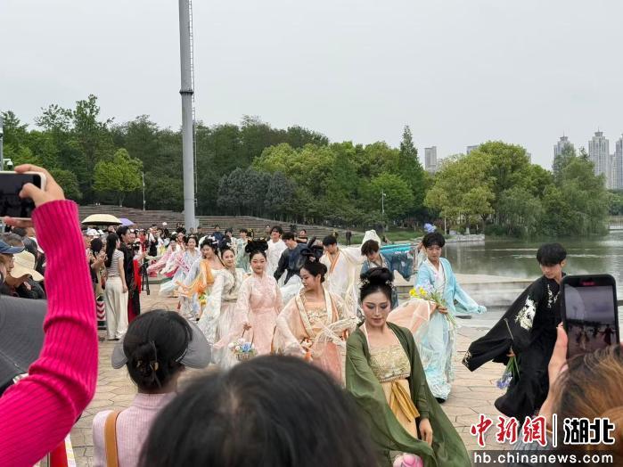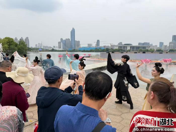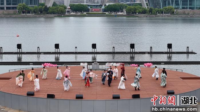 中新网湖北新闻4月17日电(张昊 王梦媛)位于武汉市汉阳区月湖风景区内的月影舞台17日下午歌舞翩跹,五位身着华服的“仙子”踏春而来,吸引众多市民游客驻足观看。