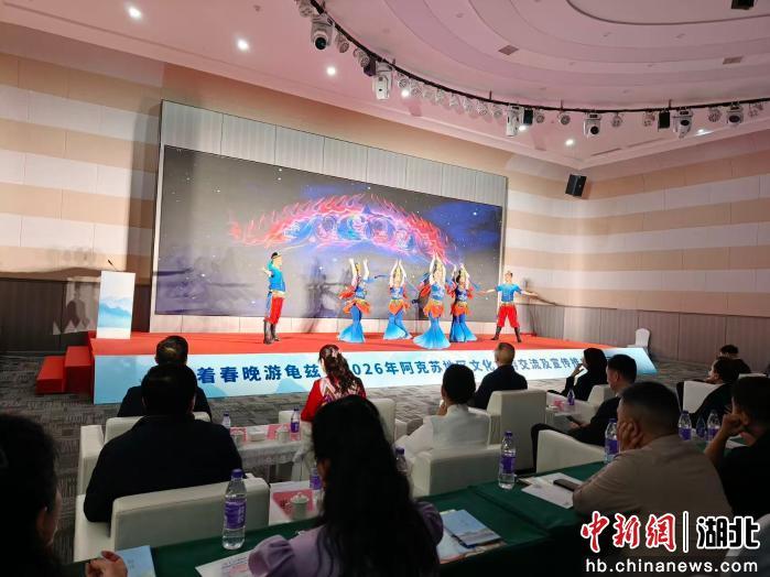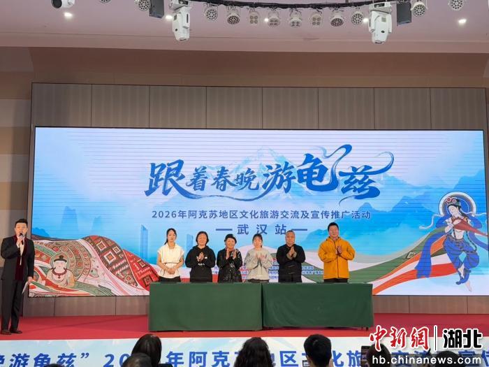 中新网湖北新闻4月21日电 (吕娜 赵金星 王梦媛)“跟着春晚游龟兹”2026阿克苏地区文化旅游交流及宣传推广活动21日上午在湖北武汉举行。活动以“丝路牵荆楚 龟兹醉江城”为主题,依托专场推介、主题展演、合作签约等形式,全方位展现阿克苏绮丽的自然风光与厚重的历史文化底蕴,进一步深化鄂阿两地文旅交融,为鄂疆文旅协作再添新篇。