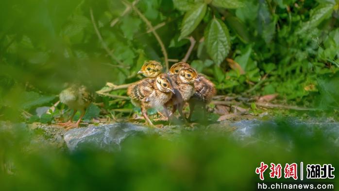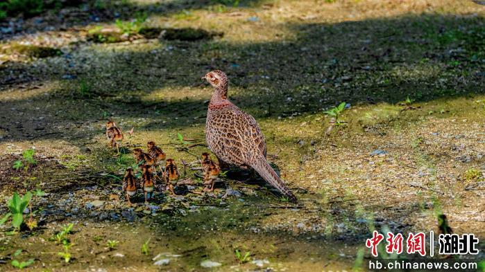 中新网湖北新闻4月21日电 (周志安 但唐静)近日,湖北赤壁生态摄影爱好者在陆水湖北岸山林,实拍到国家一级保护动物、中国特有珍稀雉类——白颈长尾雉雌鸟带领10只幼鸟在草地觅食的珍贵影像。